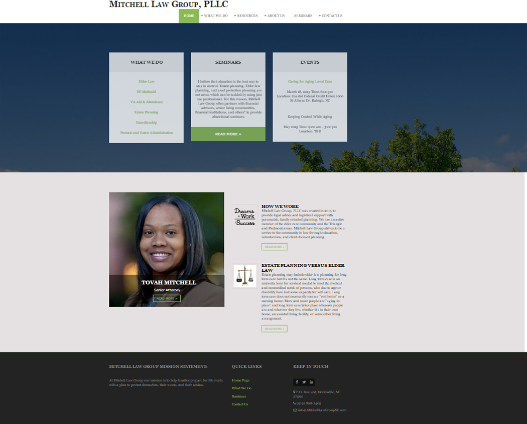 Tovah Mitchell is an attorney in the RTP, NC area. We had the pleasure of creating the site for the launch of her firm Mitchell Law Group. Bolstered by her client's desires to continue to grow relationships, becoming a better time manager in her household, and her ever burning desire to help families plan their lives Mitchell Law Group was created. If you need help with planning for your or a loved ones' life, Tovah can help with Elder Law, NC Medicaid, VA Aid & Attendance, NC Special Assistance, Estate Planning, Powers of Attorney, Trust Planning, Last Will And Testament, Guardianship, and Probate and Estate Administration.